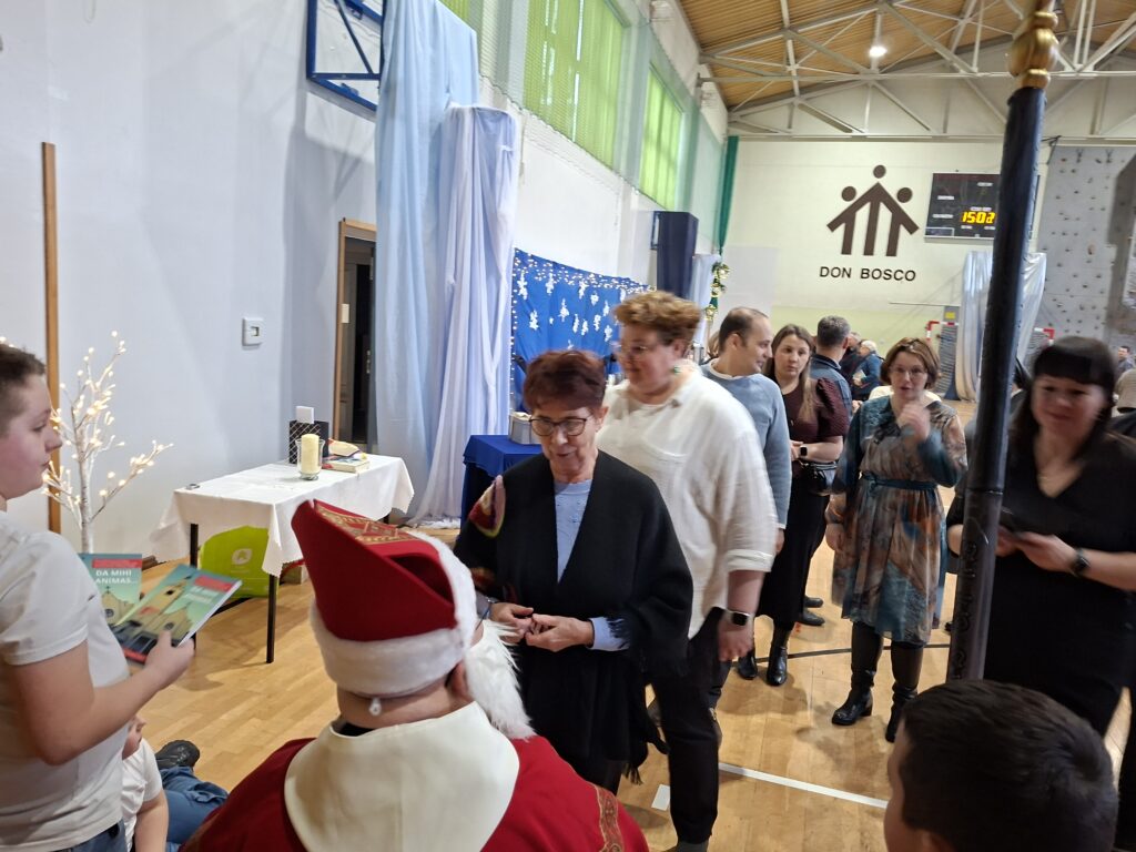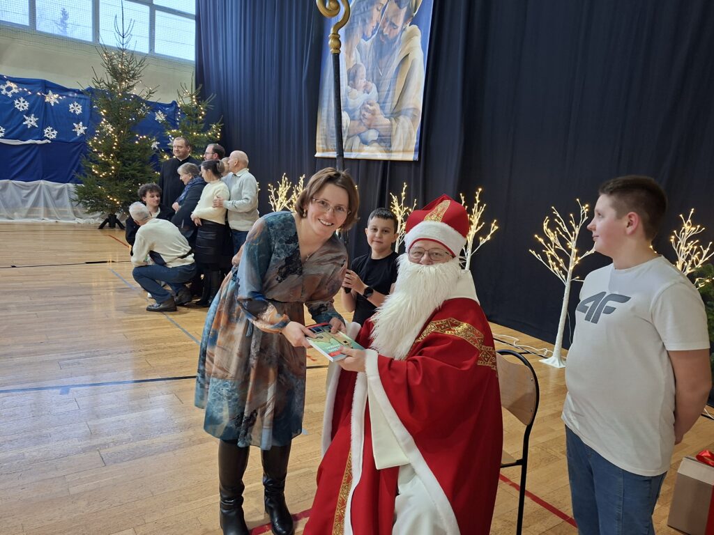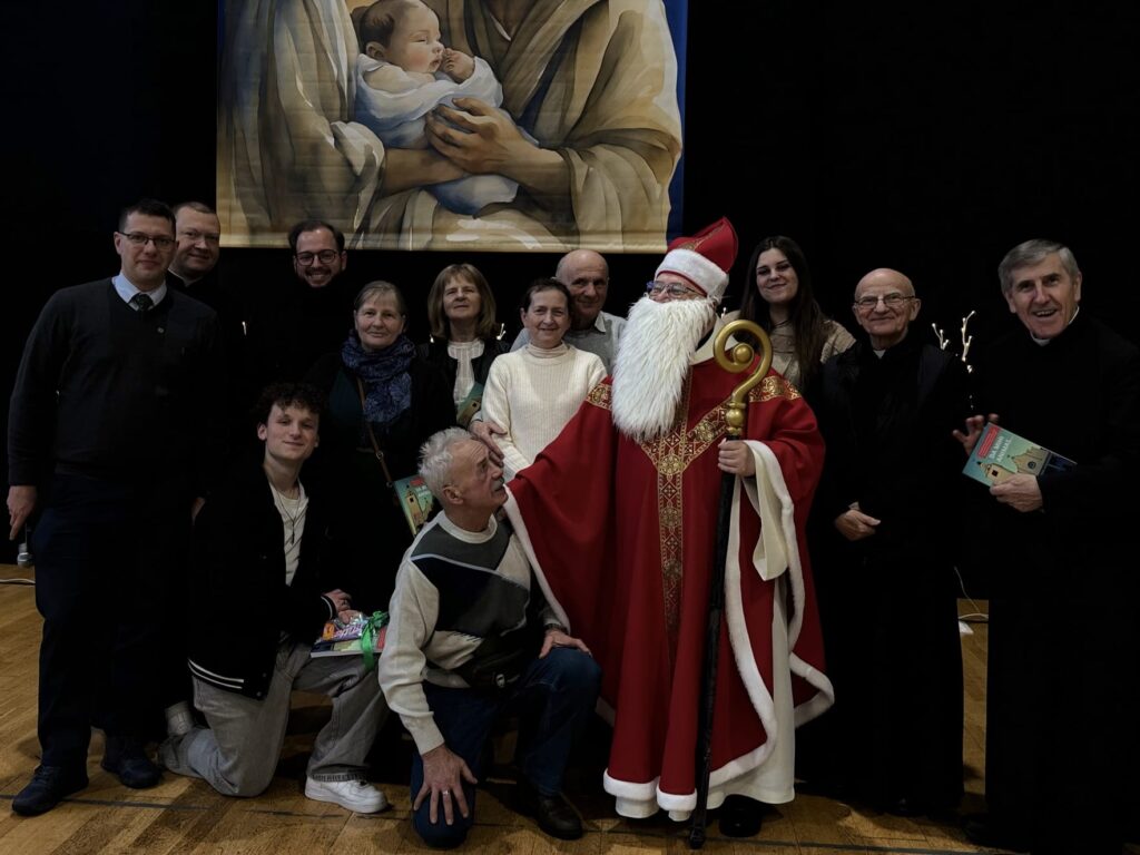 Po wspólnym obiedzie i czasie rozmów czekała na nas niespodzianka, która wywołała wiele uśmiechu – zwłaszcza wśród rodzin i najmłodszych. Do zgromadzonych przybył niezwykły gość: św. Mikołaj, który dla każdego przygotował świąteczny, salezjański upominek. Ten gest – prosty, a jednocześnie bardzo wymowny – przypomniał, że salezjańskie świętowanie zawsze ma smak dobra, serdeczności i radości, która buduje wspólnotę.