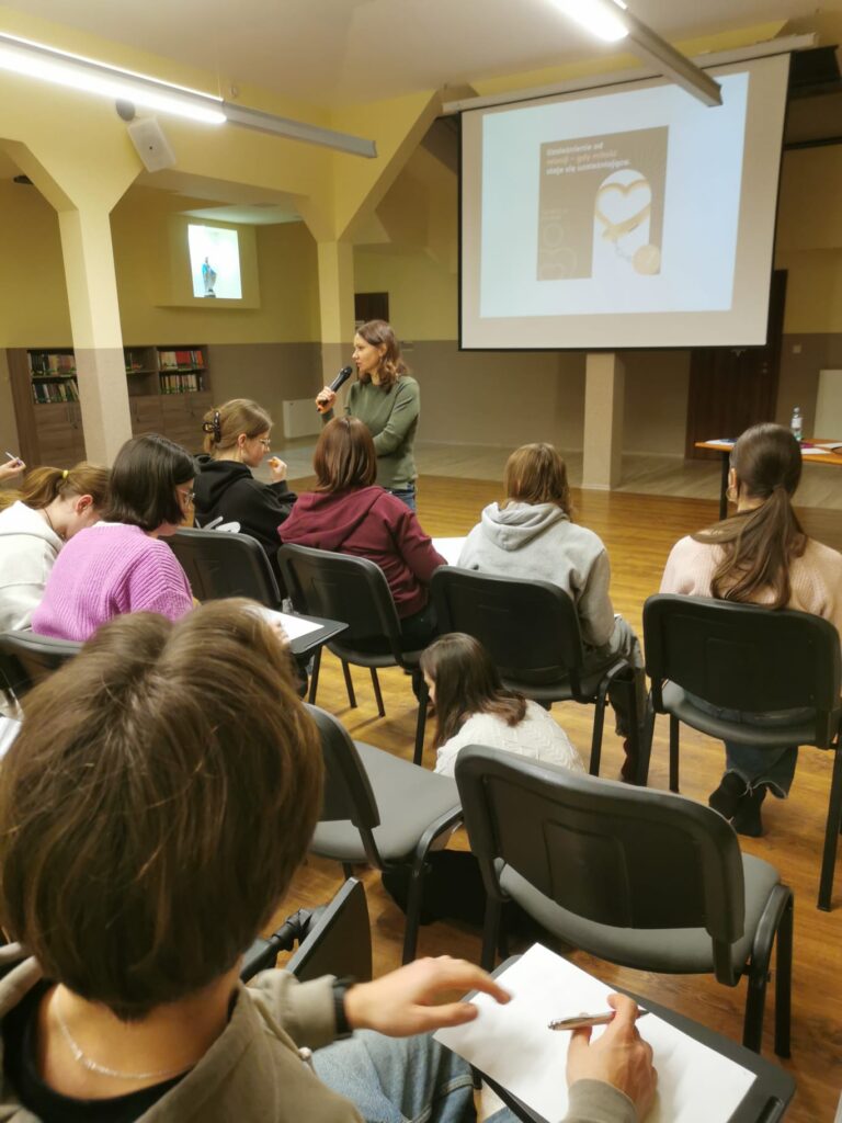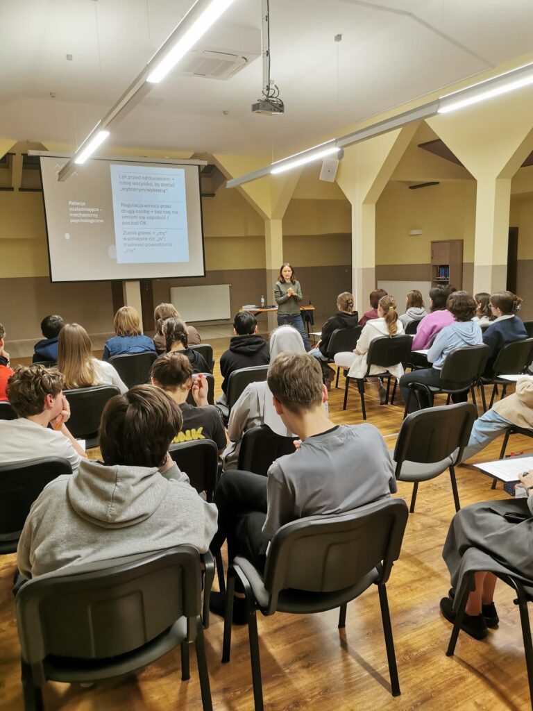 Uczestnicy spotkania zastanawiali się, jak tworzyć relacje oparte na zaufaniu, szczerości i wzajemnym szacunku, a jednocześnie jak stawiać mądre granice, pozwalające chronić własną wolność i godność. Prowadząca podkreśliła, że dojrzała relacja – czy to przyjacielska, czy miłosna – rodzi się z wolności serca, a nie z lęku, kontroli czy nadmiernego przywiązania.